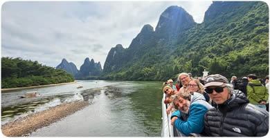 Nos despedimos de Guilin navegando el río Li entre montañas kársticas hasta Yangshuo, explorando su campo antes de continuar hacia Hangzhou.