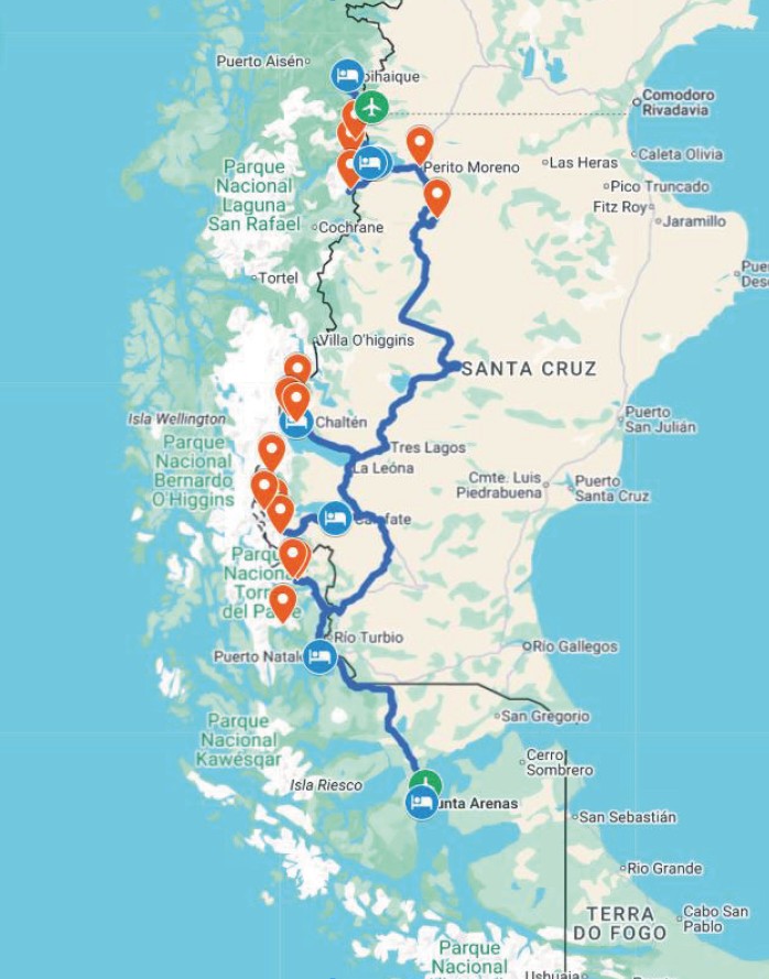 Una ruta única por la Patagonia Sur de Chile y Argentina, uniendo en un solo viaje lugares icónicos como Punta Arenas, Puerto Natales, Torres del Paine, El Calafate, Perito Moreno, El Chaltén, la Ruta 40, Los Antiguos, Cueva de las Manos, Chile Chico, Parque Patagonia, Jeinimeni, Lago General Carrera, Puerto Ibáñez y Coyhaique.